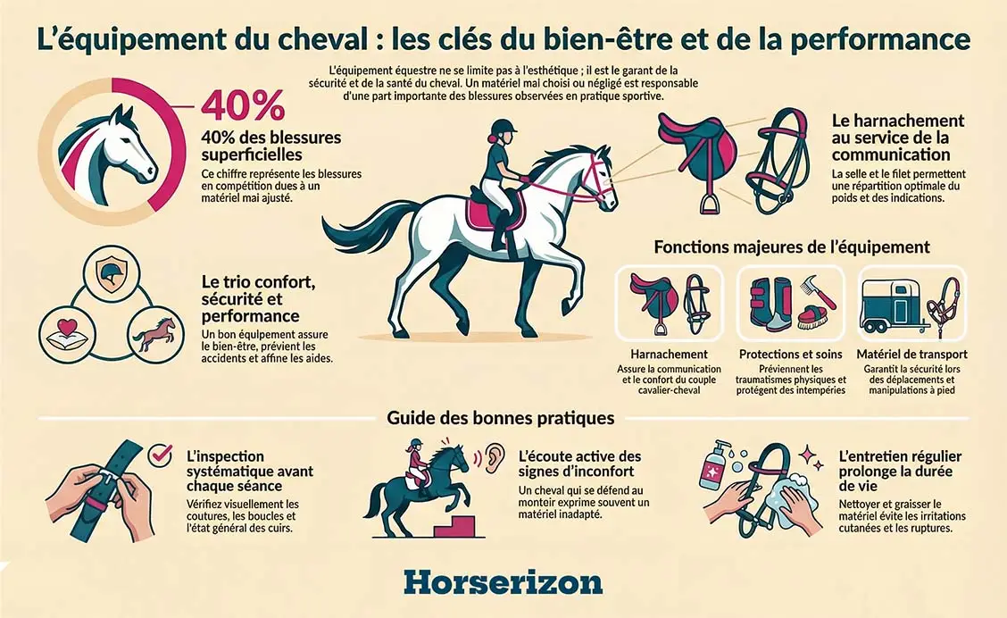 Par exemple, une selle adaptée répartit le poids du cavalier pour éviter les blessures au dos du cheval, et un mors bien choisi facilite la finesse des indications.