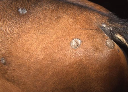 Il est recommandé d’isoler un cheval atteint durant toute la durée du traitement, soit environ 3 à 6 semaines, et jusqu’à disparition complète des lésions visibles.